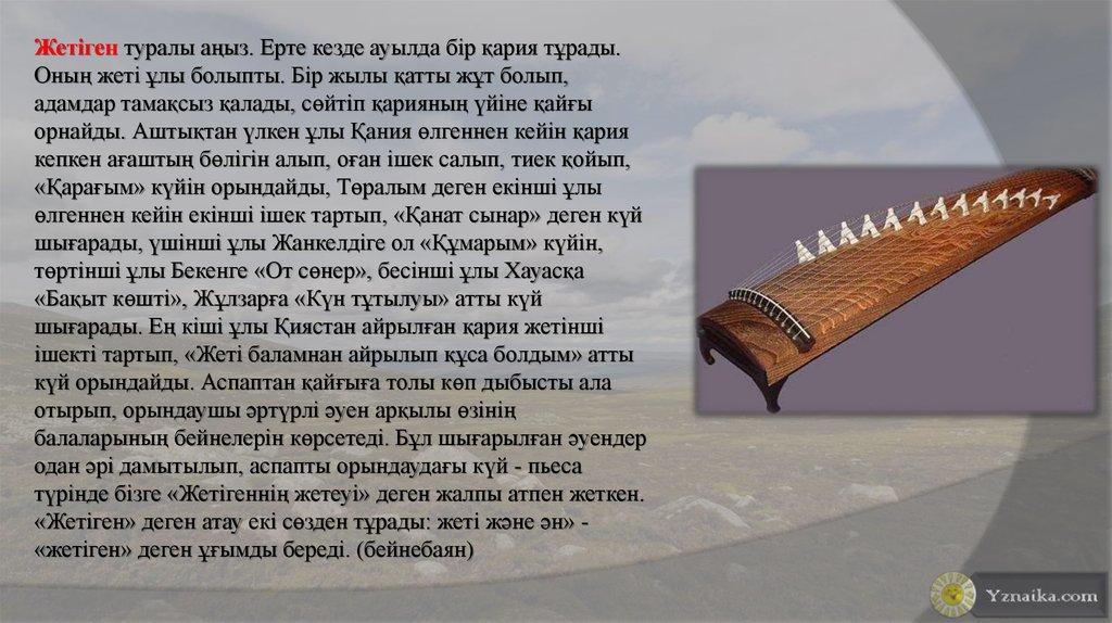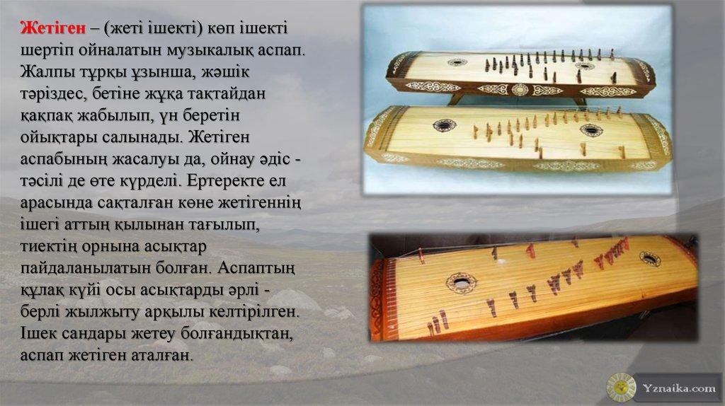 Жетіген – (жеті ішекті) көп ішектішертіп ойналатын музыкалық аспап.