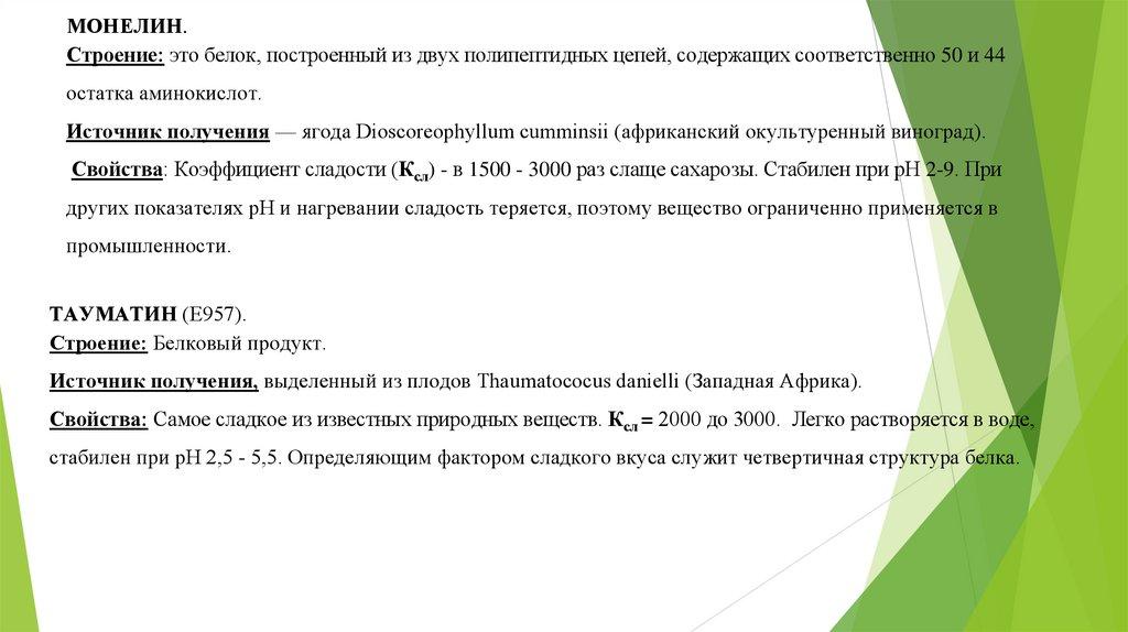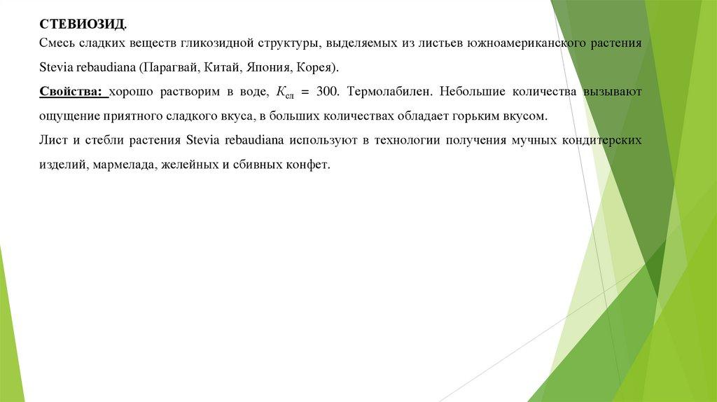 хорошей температурной, кислотной и щелочной стойкостью. Ксл = 30 (сладость в 30 раз