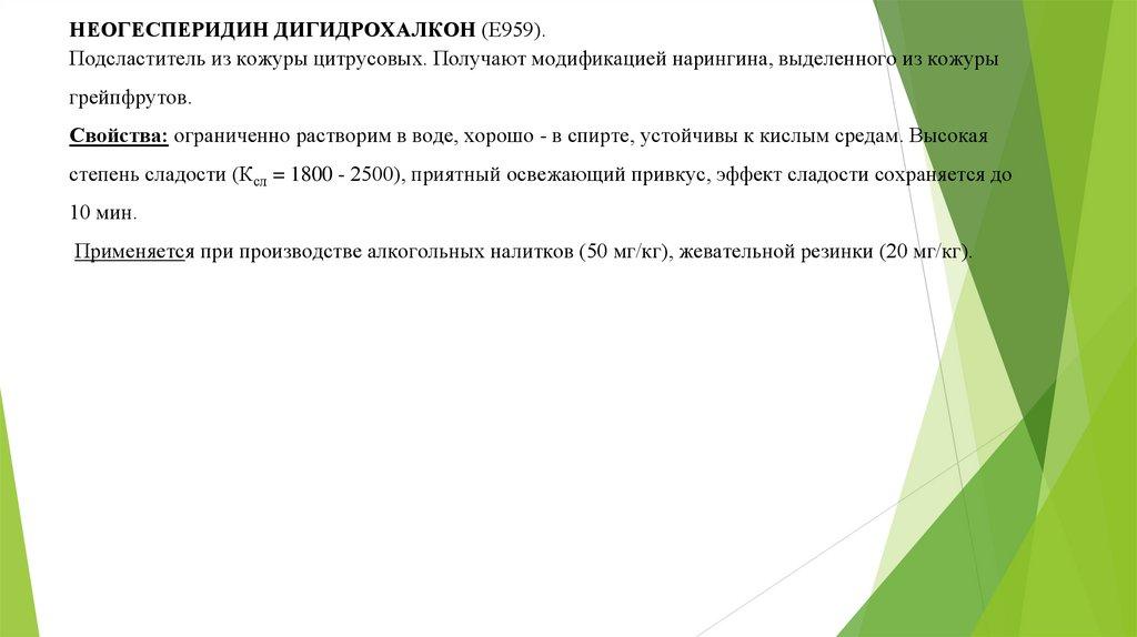 НЕОГЕСПЕРИДИН ДИГИДРОХАЛКОН (Е959).Подсластитель из кожуры цитрусовых. Получают модификацией нарингина, выделенного из кожуры