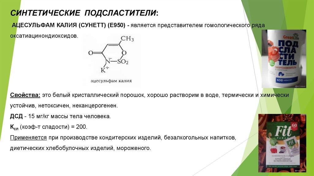 СИНТЕТИЧЕСКИЕ ПОДСЛАСТИТЕЛИ:АЦЕСУЛЬФАМ КАЛИЯ (СУНЕТТ) (Е950) - является представителем гомологического ряда