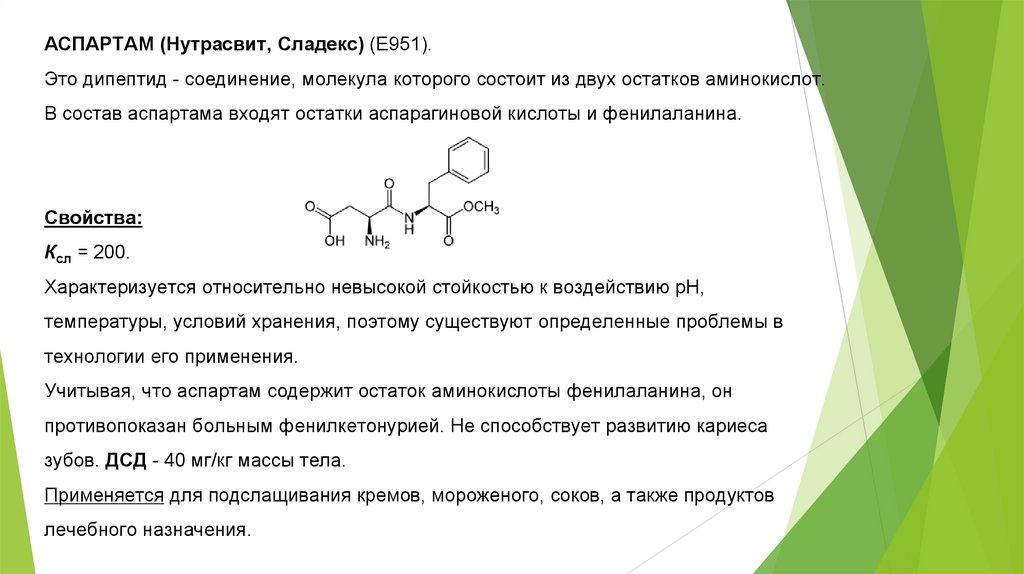 АСПАРТАМ (Нутрасвит, Сладекс) (Е951).Это дипептид - соединение, молекула которого состоит из двух остатков аминокислот.