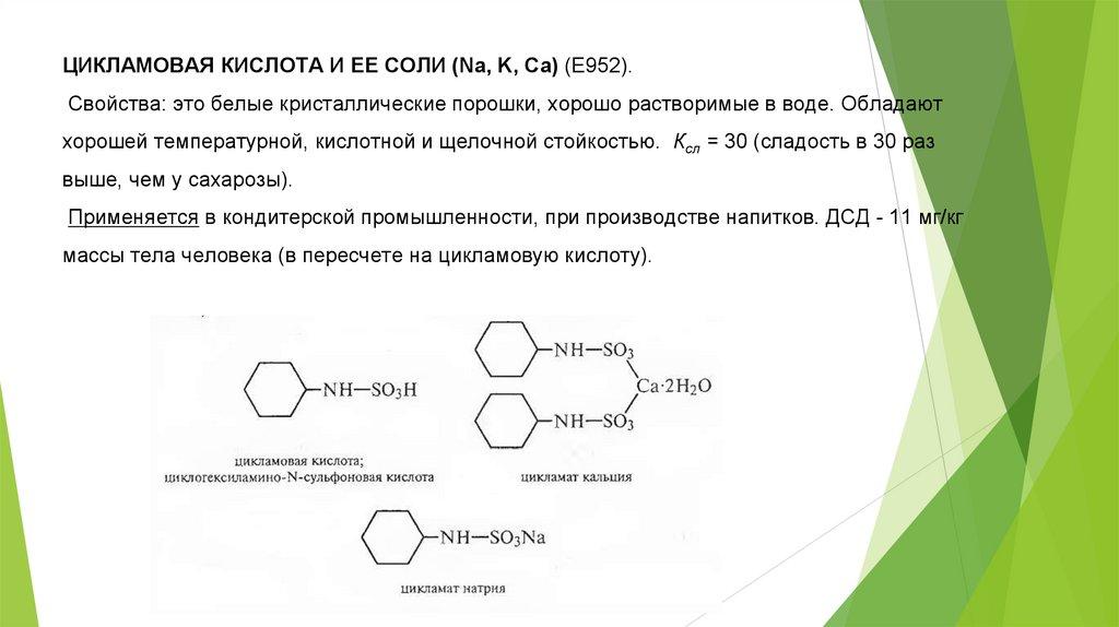 ЦИКЛАМОВАЯ КИСЛОТА И ЕЕ СОЛИ (Na, K, Ca) (Е952).Свойства: это белые кристаллические порошки, хорошо растворимые в воде. Обладают