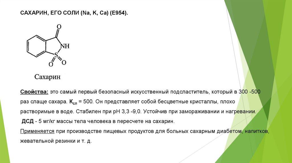 САХАРИН, ЕГО СОЛИ (Na, K, Ca) (Е954).Свойства: это самый первый безопасный искусственный подсластитель, который в 300 -500