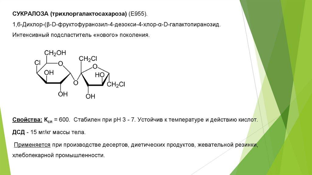 СУКРАЛОЗА (трихлоргалактосахароза) (Е955).1,6-Дихлор-(β-D-фруктофуранозил-4-дезокси-4-хлор-α-D-галактопиранозид.