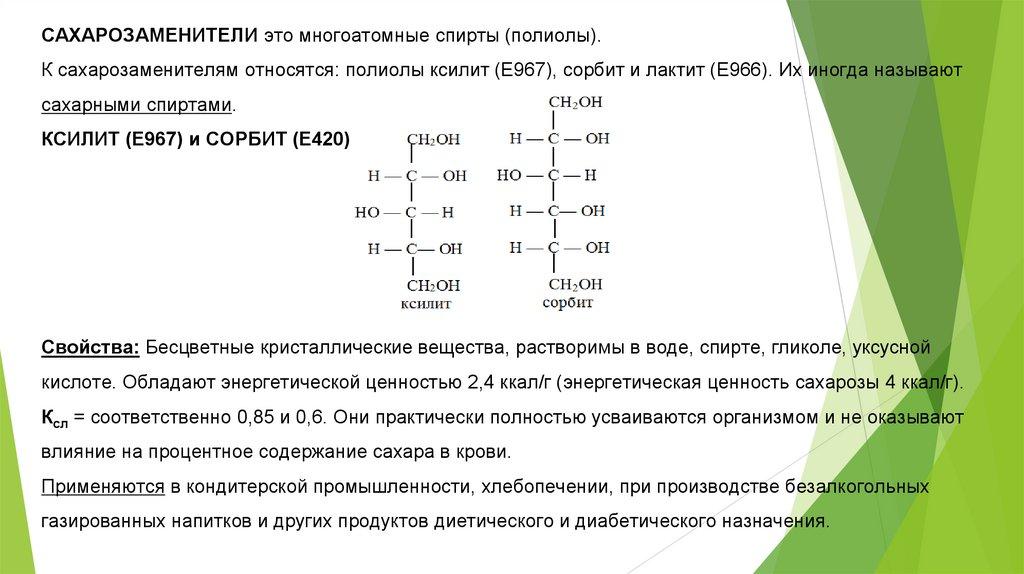 САХАРОЗАМЕНИТЕЛИ это многоатомные спирты (полиолы).К сахарозаменителям относятся: полиолы ксилит (Е967), сорбит и лактит (Е966). Их иногда называют