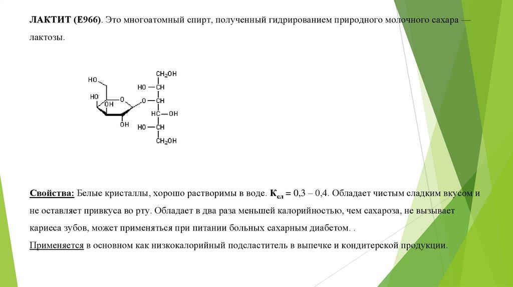 ЛАКТИТ (Е966). Это многоатомный спирт, полученный гидрированием природного молочного сахара —лактозы.