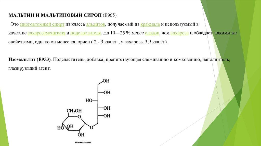МАЛЬТИН И МАЛЬТИНОВЫЙ СИРОП (Е965).Это многоатомный спирт из класса альдитов, получаемый из крахмала и используемый в