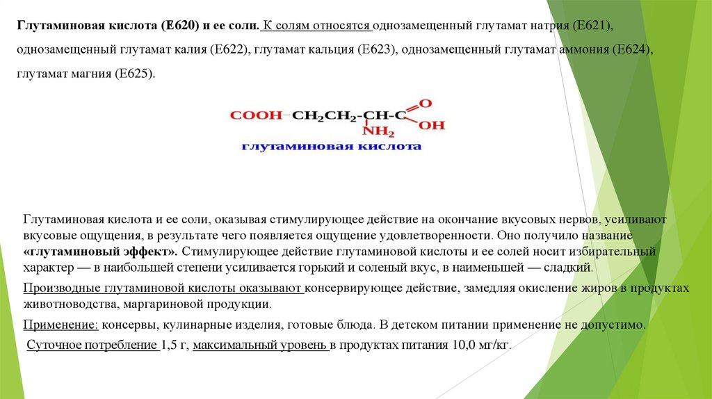 Глутаминовая кислота (Е620) и ее соли. К солям относятся однозамещенный глутамат натрия (Е621),однозамещенный глутамат калия (Е622), глутамат кальция (Е623), однозамещенный глутамат аммония (Е624),
