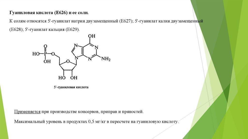 Гуаниловая кислота (Е626) и ее соли.К солям относятся 5'-гуанилат натрия двузамещенный (Е627); 5'-гуанилат калия двузамещенный