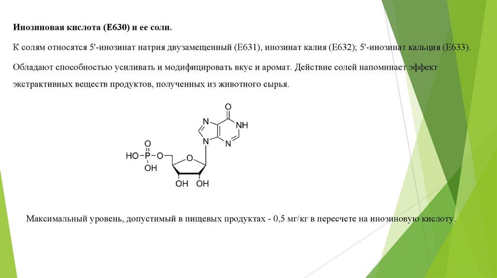 Инозиновая кислота (Е630) и ее соли.К солям относятся 5'-инозинат натрия двузамещенный (Е631), инозинат калия (Е632); 5'-инозинат кальция (Е633).