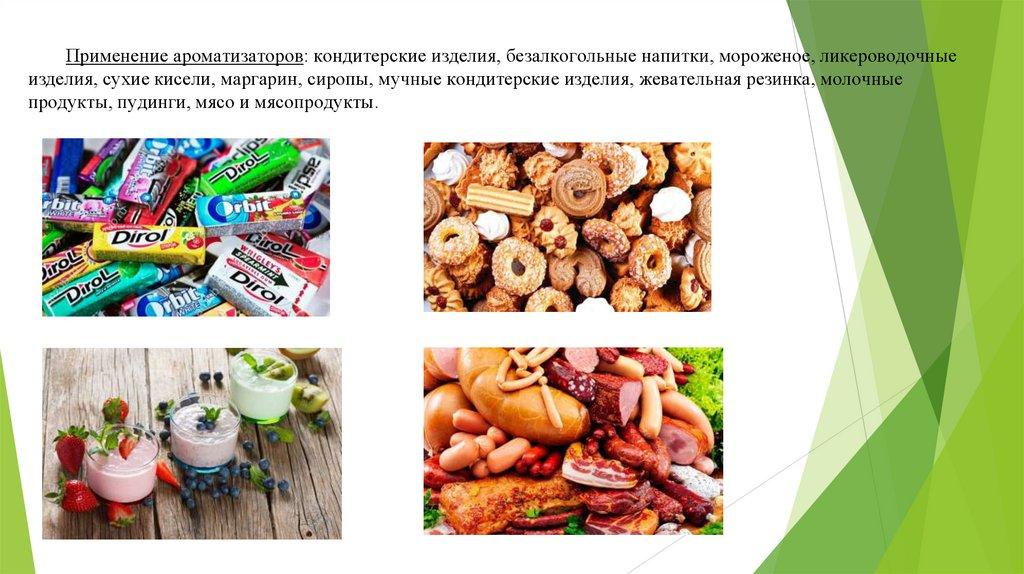 Применение ароматизаторов: кондитерские изделия, безалкогольные напитки, мороженое, ликероводочныеизделия, сухие кисели, маргарин, сиропы, мучные кондитерские изделия, жевательная резинка, молочные