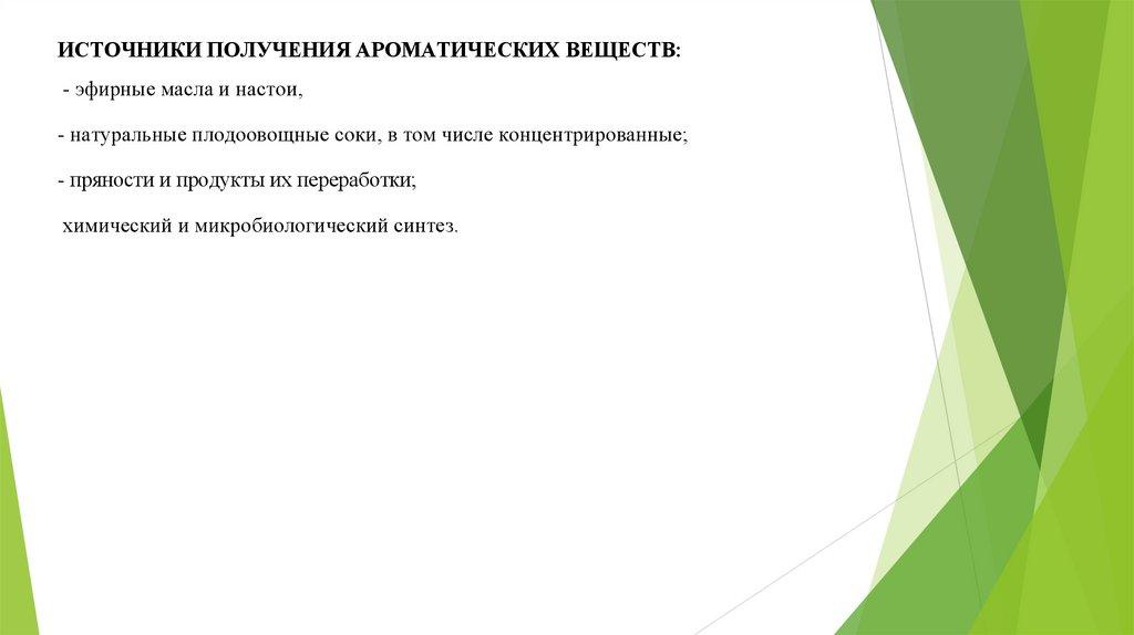 ИСТОЧНИКИ ПОЛУЧЕНИЯ АРОМАТИЧЕСКИХ ВЕЩЕСТВ:- эфирные масла и настои,