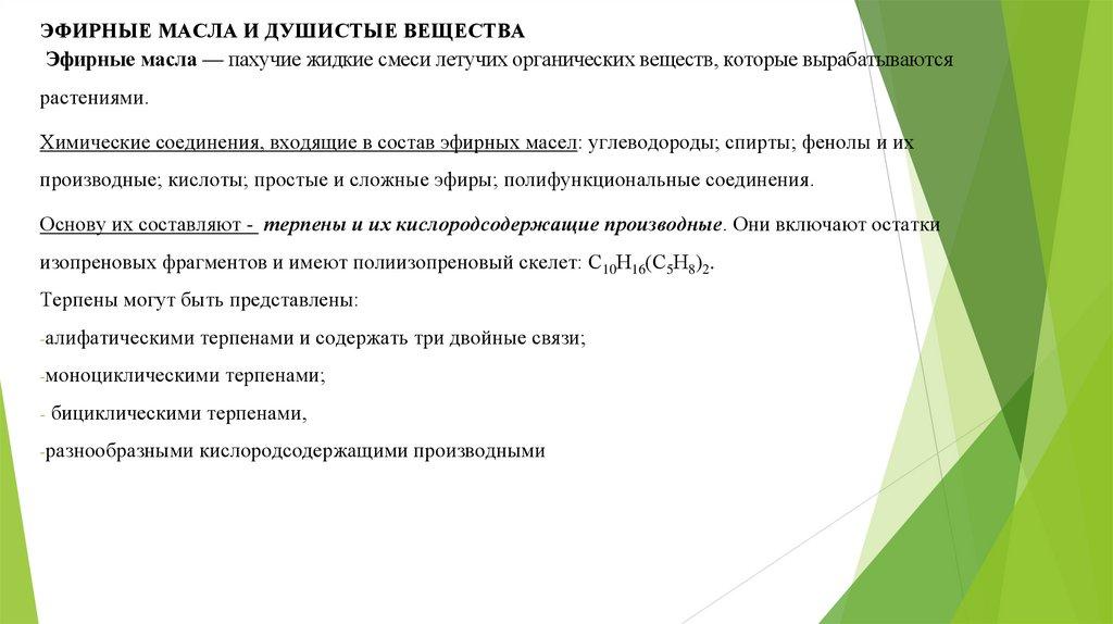 Основу их составляют - терпены и их кислородсодержащие производные. Они включают остатки