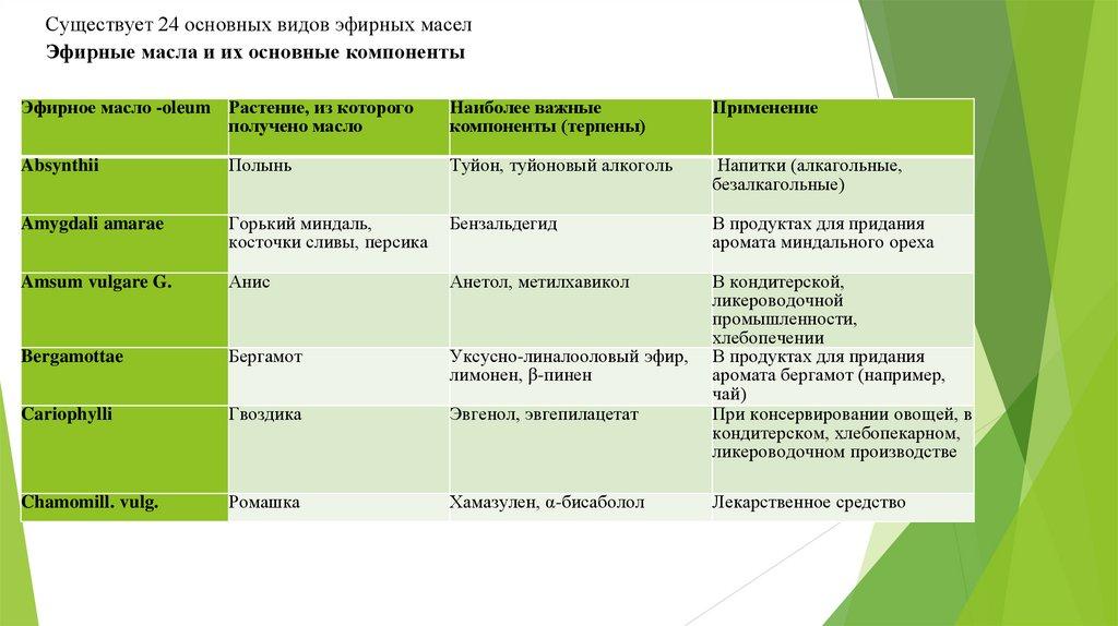 Существует 24 основных видов эфирных маселЭфирные масла и их основные компоненты