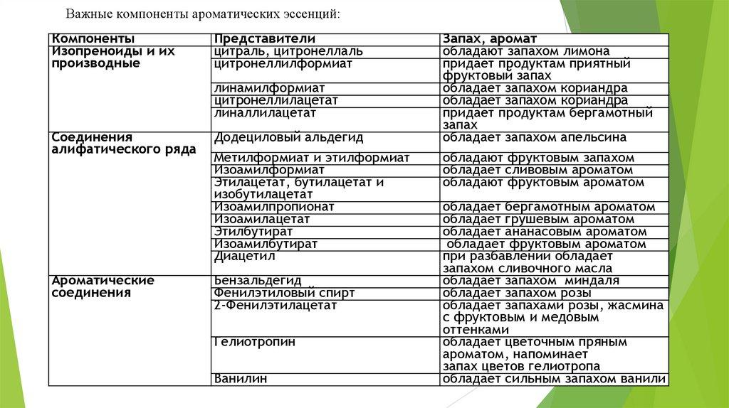 Химические соединения, входящие в состав эфирных масел: углеводороды; спирты; фенолы и их
