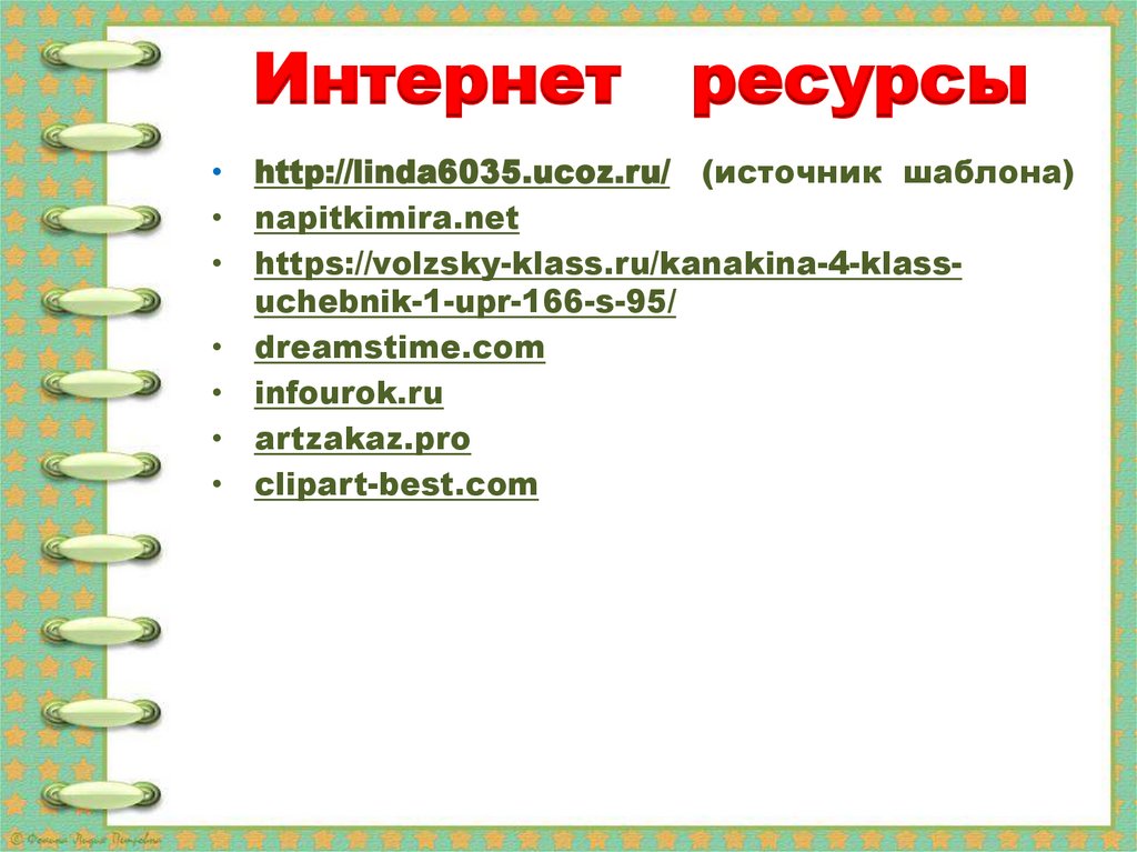 Интернет ресурсы• http://linda6035.ucoz.ru/ (источник шаблона)