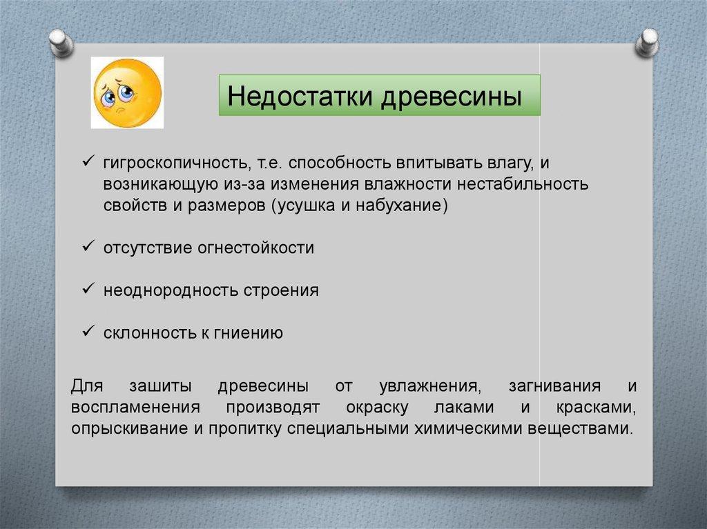 Недостатки древесиныгигроскопичность, т.е. способность впитывать влагу, и