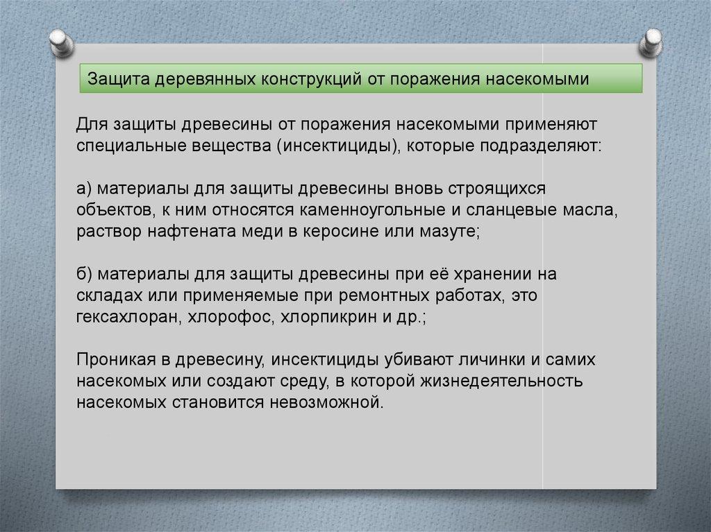 Защита деревянных конструкций от поражения насекомымиДля защиты древесины от поражения насекомыми применяют