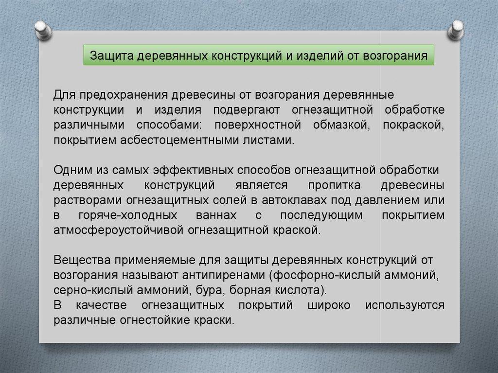 Защита деревянных конструкций и изделий от возгоранияДля предохранения древесины от возгорания деревянные
