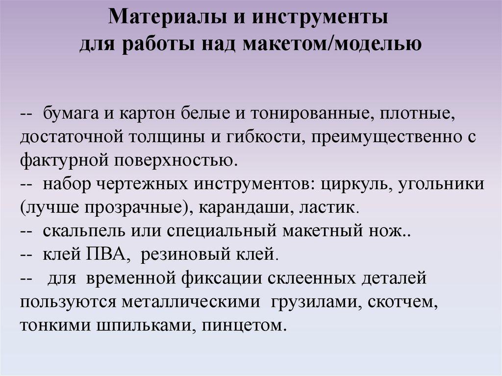 Материалы и инструментыдля работы над макетом/моделью