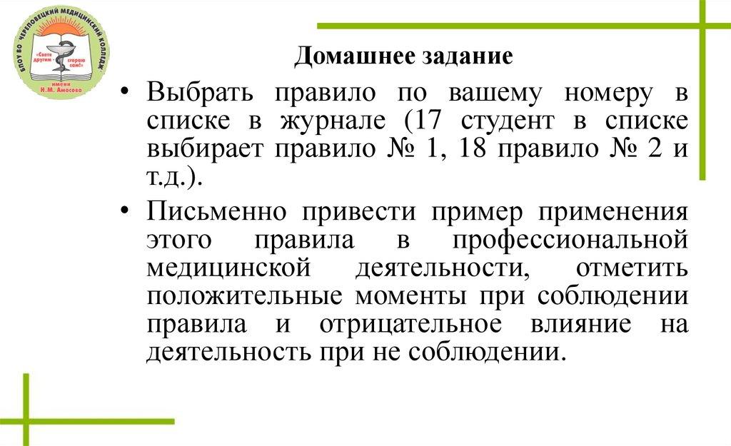 Домашнее задание• Выбрать правило по вашему номеру в