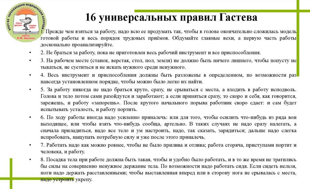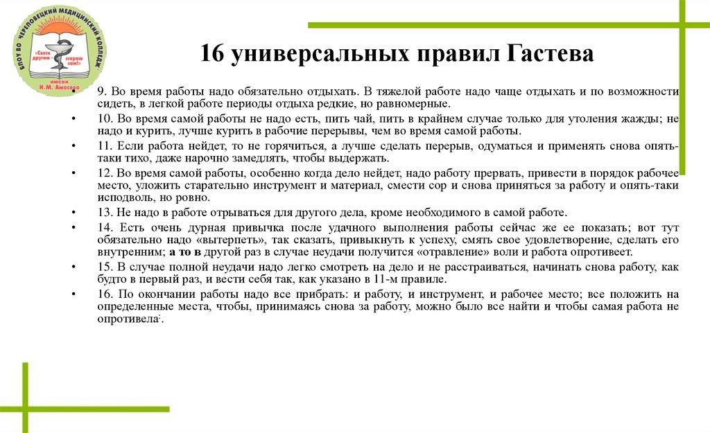 16 универсальных правил Гастева9. Во время работы надо обязательно отдыхать. В тяжелой работе надо чаще отдыхать и по возможности
