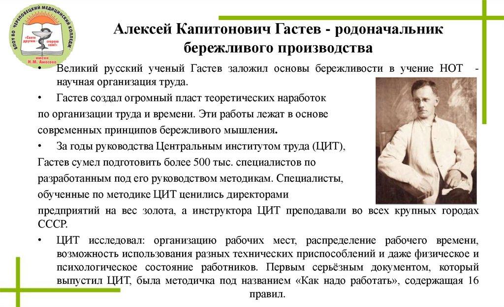 Великий русский ученый Гастев заложил основы бережливости в учение НОТ научная организация труда.