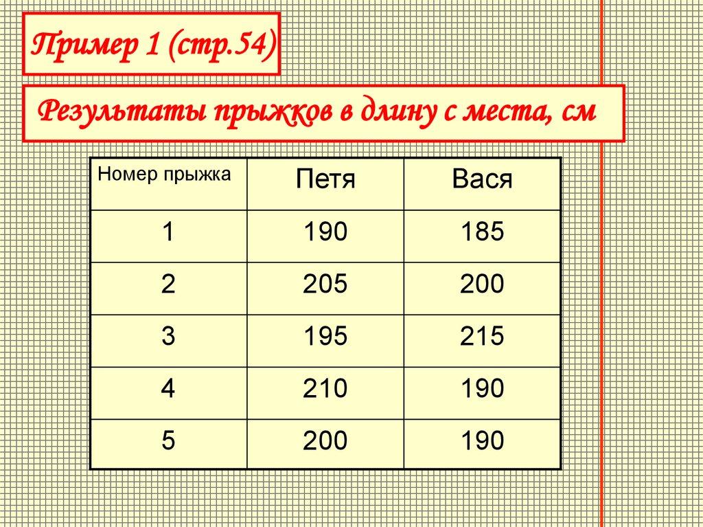 Пример 1 (стр.54)Результаты прыжков в длину с места, см