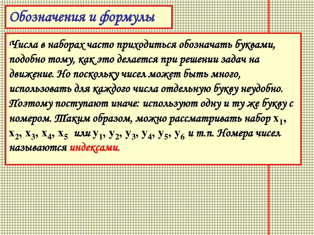 Обозначения и формулыЧисла в наборах часто приходиться обозначать буквами,