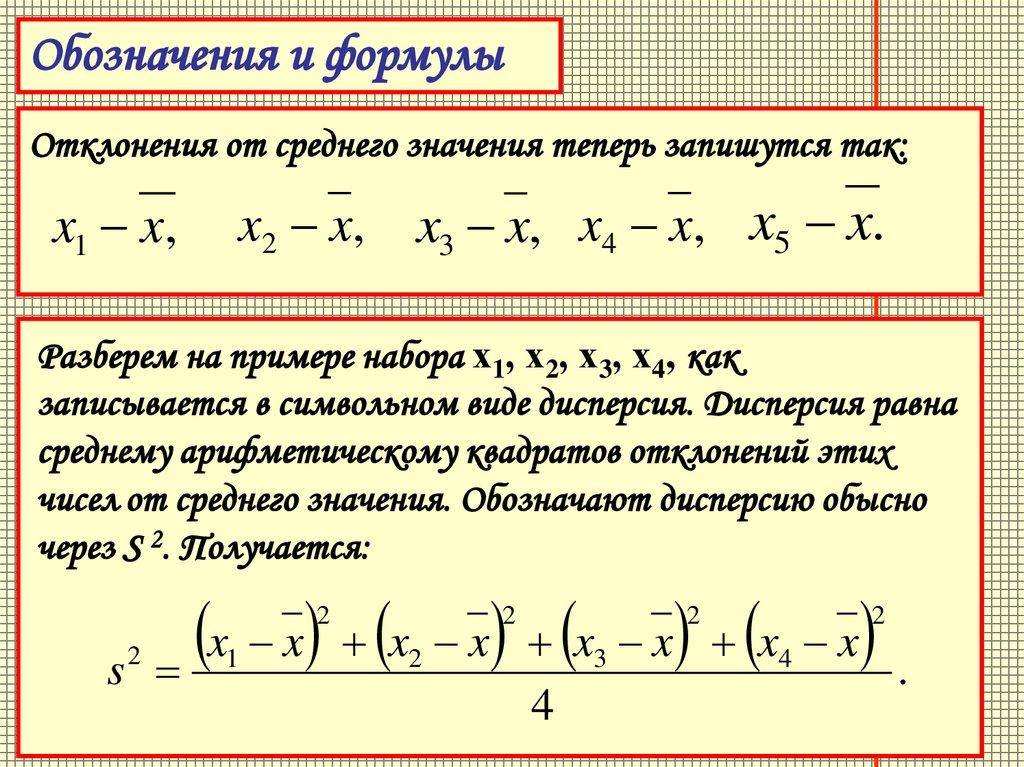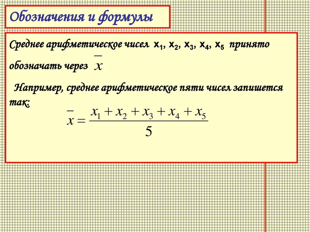 Обозначения и формулыСреднее арифметическое чисел х1, х2, х3, х4, х5 принято