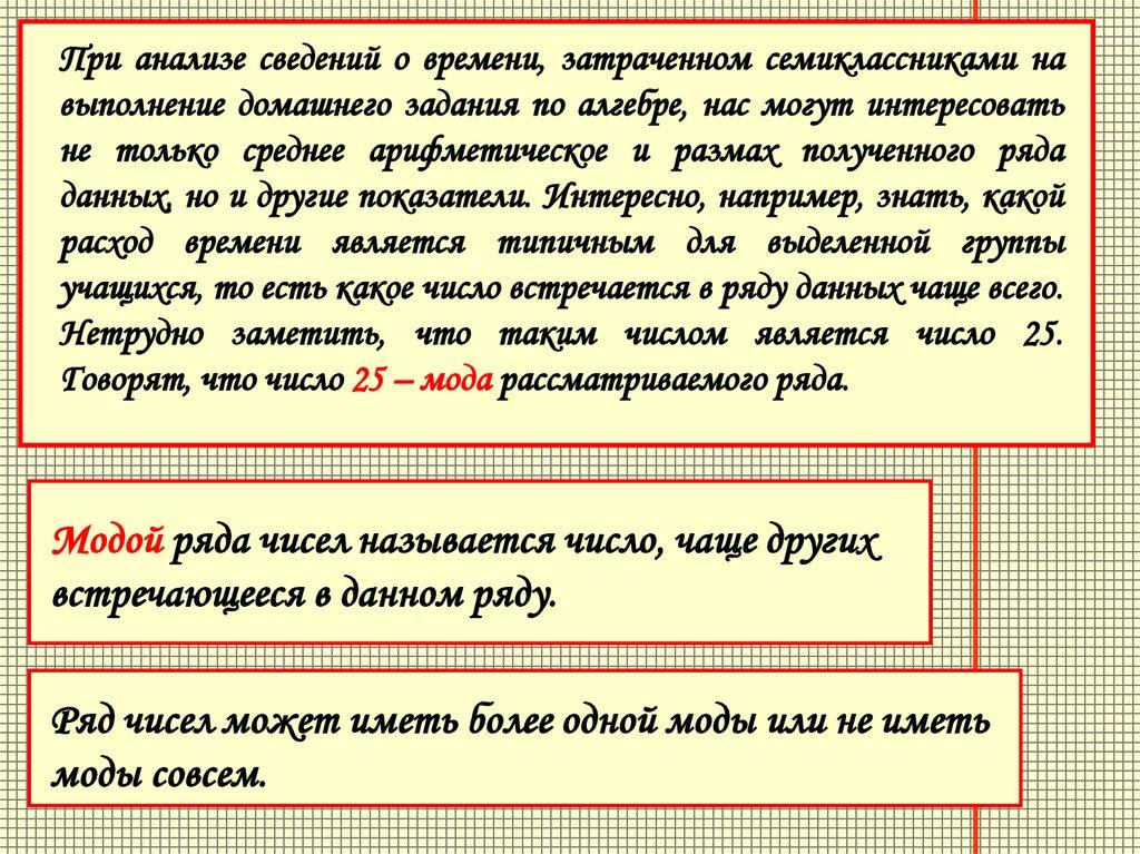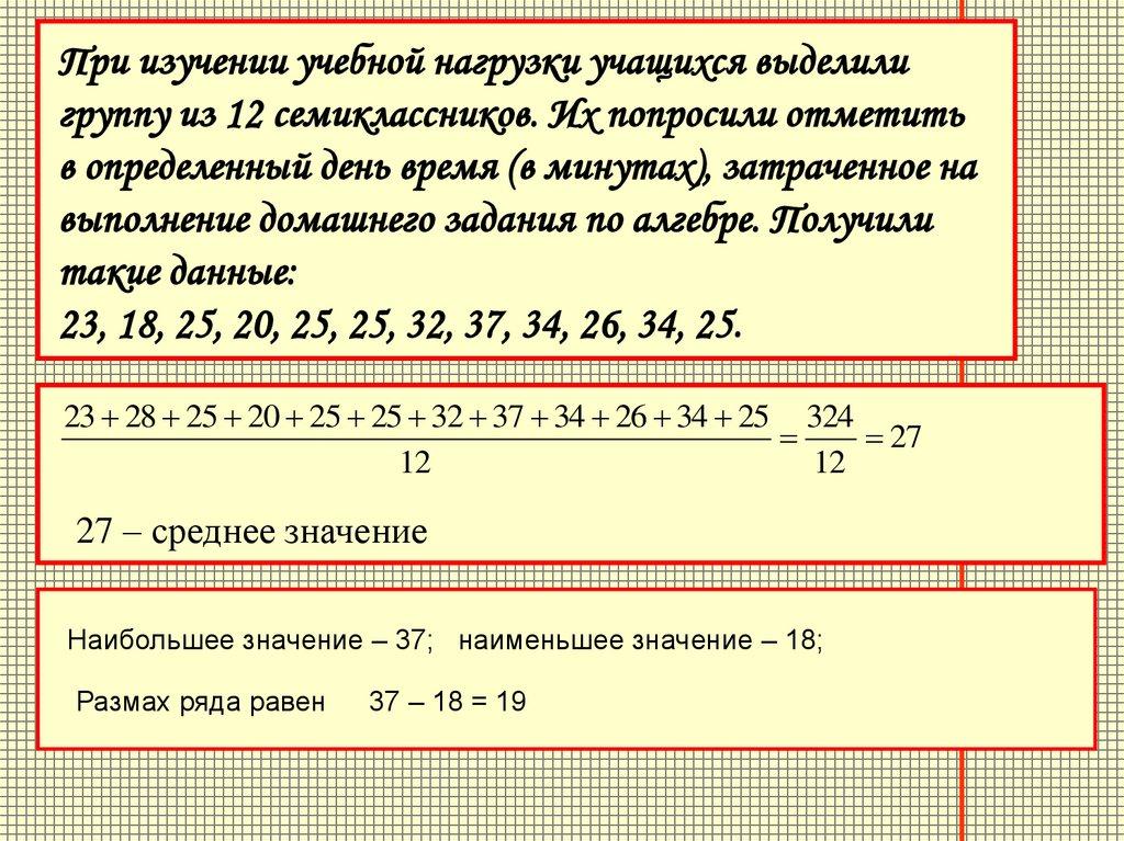 При анализе сведений о времени, затраченном семиклассниками навыполнение домашнего задания по алгебре, нас могут интересовать