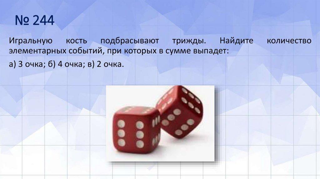 № 244Игральную кость подбрасывают трижды. Найдите