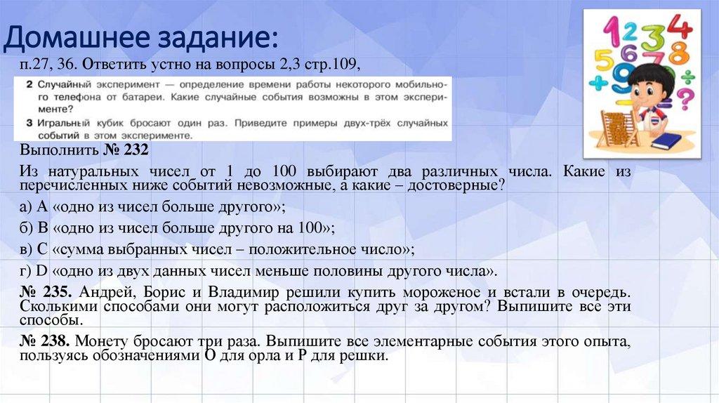 № 231Игральную кость бросают два раза. Укажите, какие