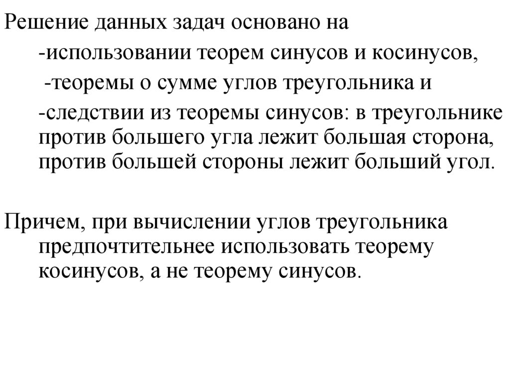 Решение данных задач основано на-использовании теорем синусов и косинусов,