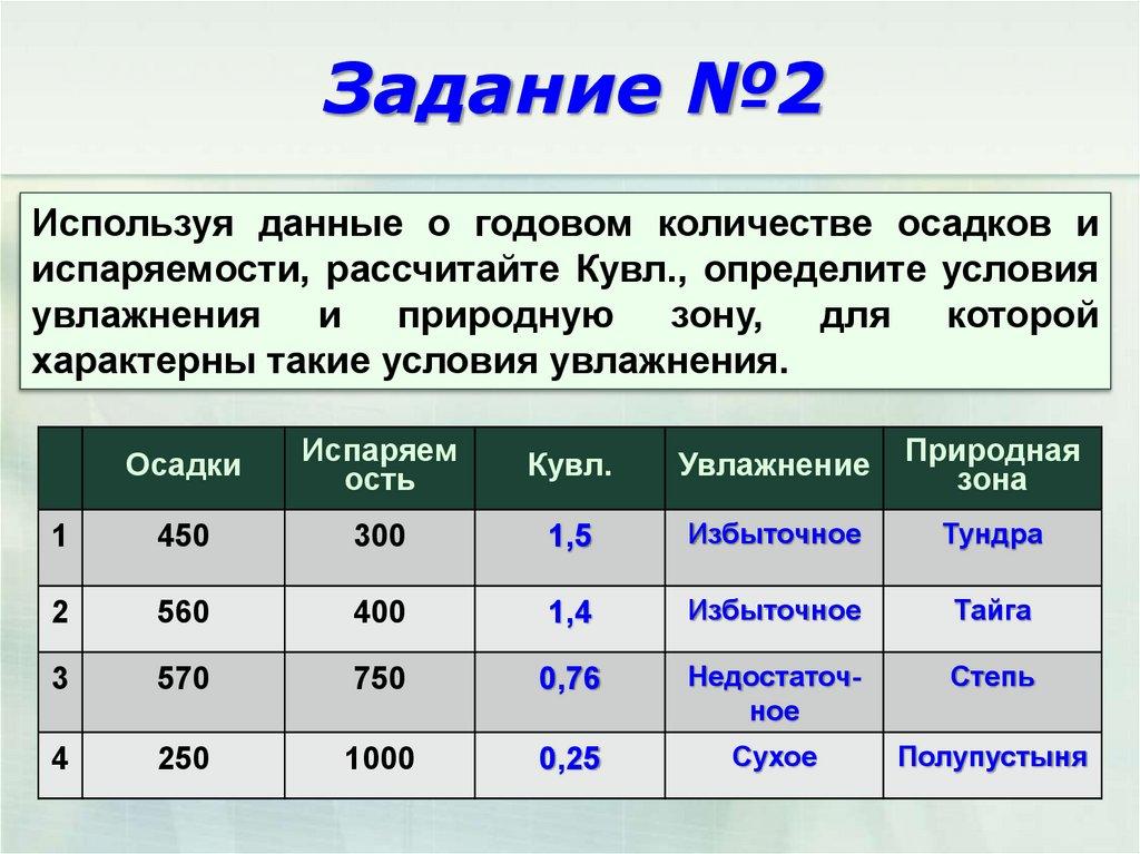 6. Коэффициент увлажнения - отношение годового количества осадков к годовой величине испаряемости
