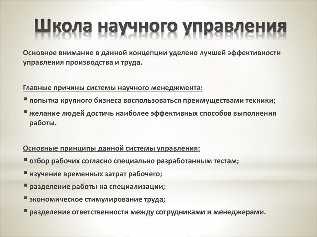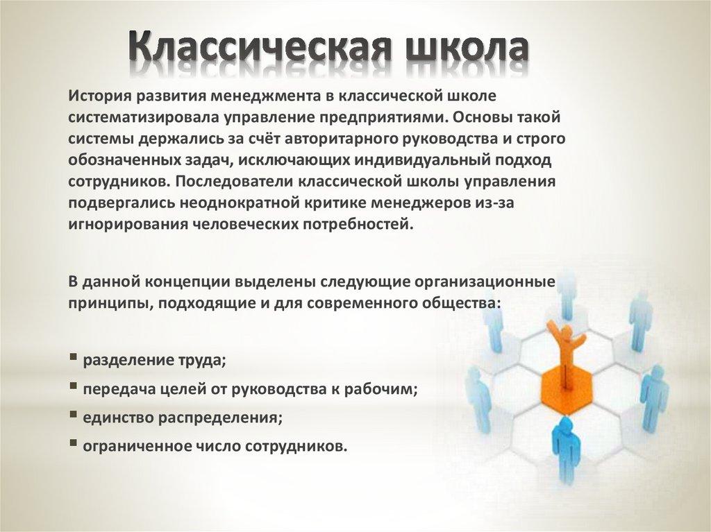 17) В данной школе выделены следующие организационные принципы:разделение труда; передача целей от руководства к рабочим; единство