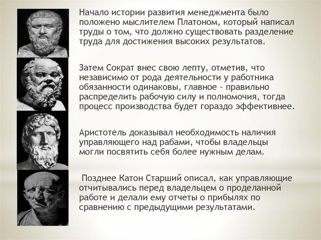 Начало истории развития менеджмента былоположено мыслителем Платоном, который написал