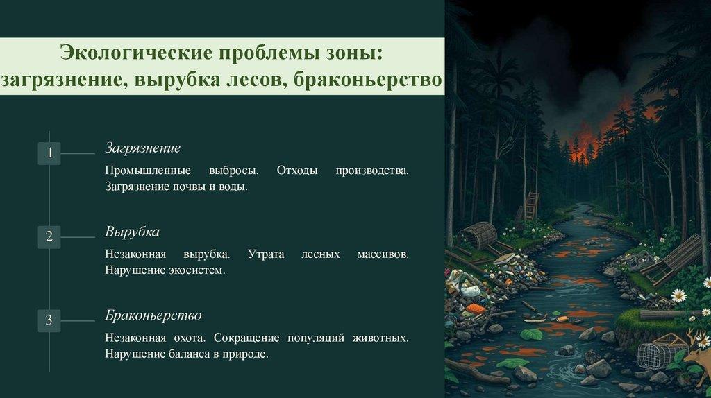 Экологические проблемы зоны:загрязнение, вырубка лесов, браконьерство