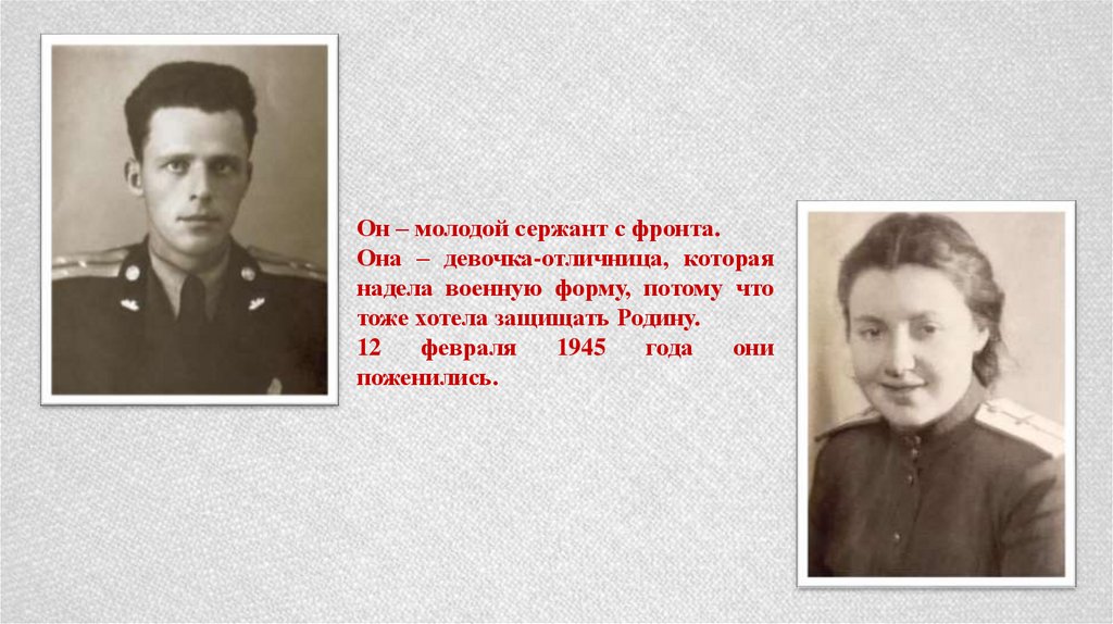 Он – молодой сержант с фронта.Она – девочка-отличница, которая