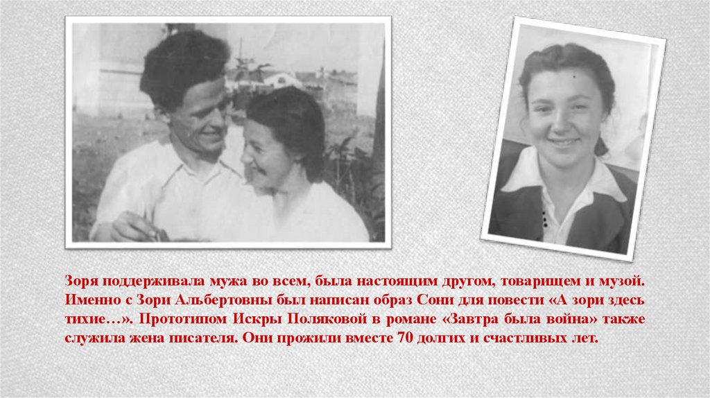 Зоря поддерживала мужа во всем, была настоящим другом, товарищем и музой.Именно с Зори Альбертовны был написан образ Сони для повести «А зори здесь