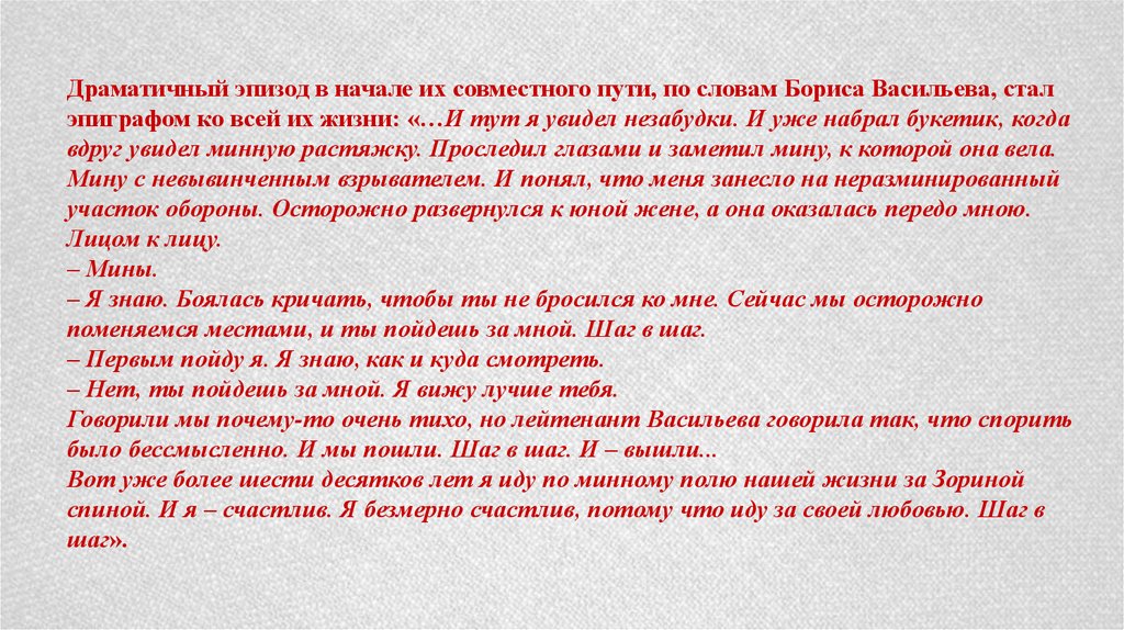 Драматичный эпизод в начале их совместного пути, по словам Бориса Васильева, сталэпиграфом ко всей их жизни: «…И тут я увидел незабудки. И уже набрал букетик, когда