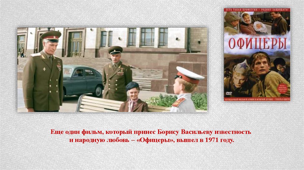 Еще один фильм, который принес Борису Васильеву известностьи народную любовь – «Офицеры», вышел в 1971 году.