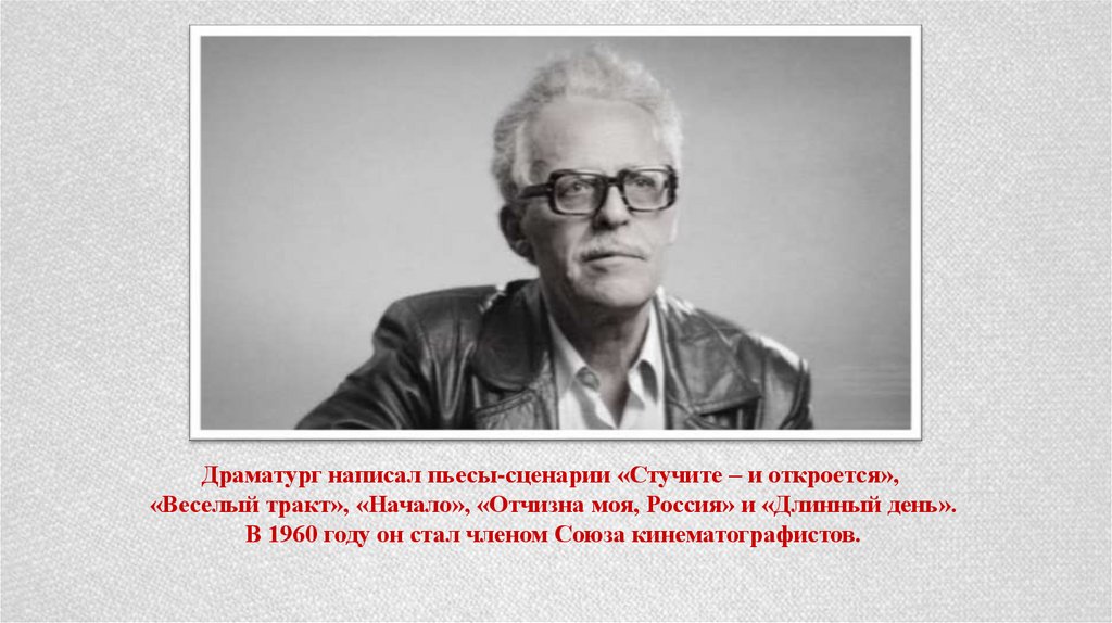 Драматург написал пьесы-сценарии «Стучите – и откроется»,«Веселый тракт», «Начало», «Отчизна моя, Россия» и «Длинный день».
