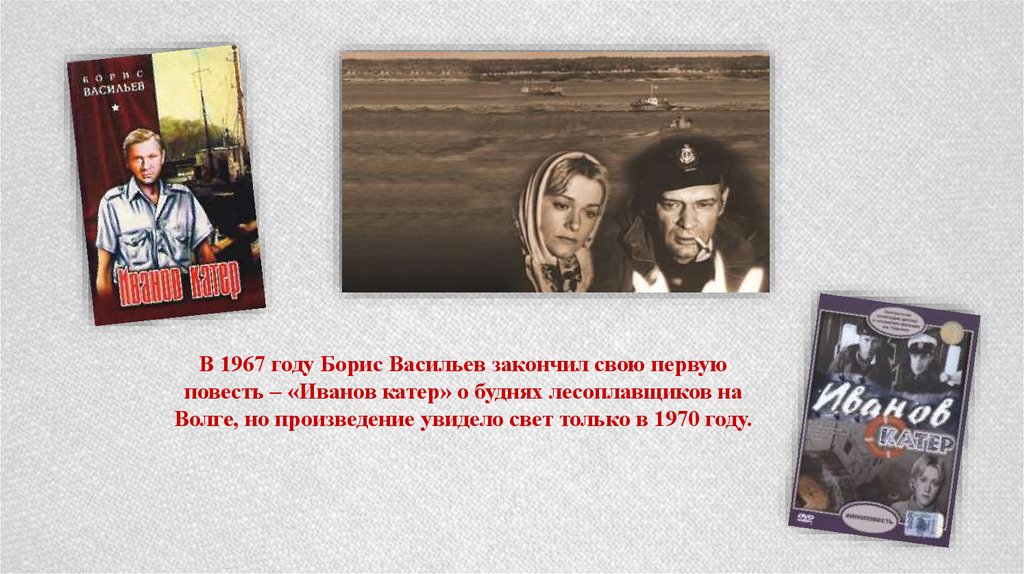 В 1967 году Борис Васильев закончил свою первуюповесть – «Иванов катер» о буднях лесоплавщиков на