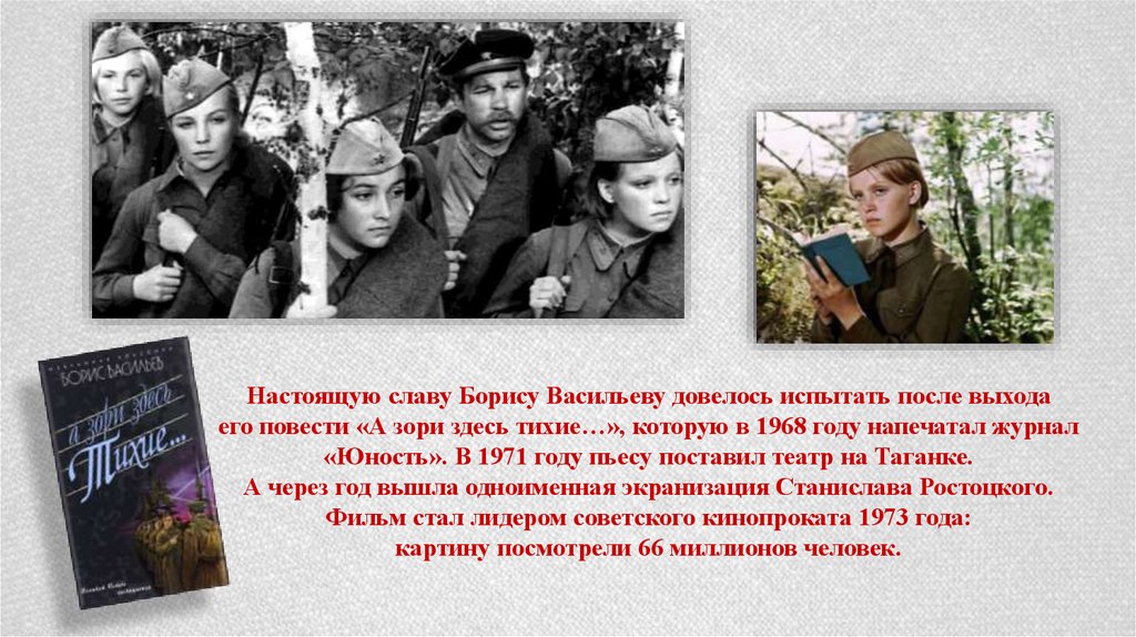 Настоящую славу Борису Васильеву довелось испытать после выходаего повести «А зори здесь тихие…», которую в 1968 году напечатал журнал