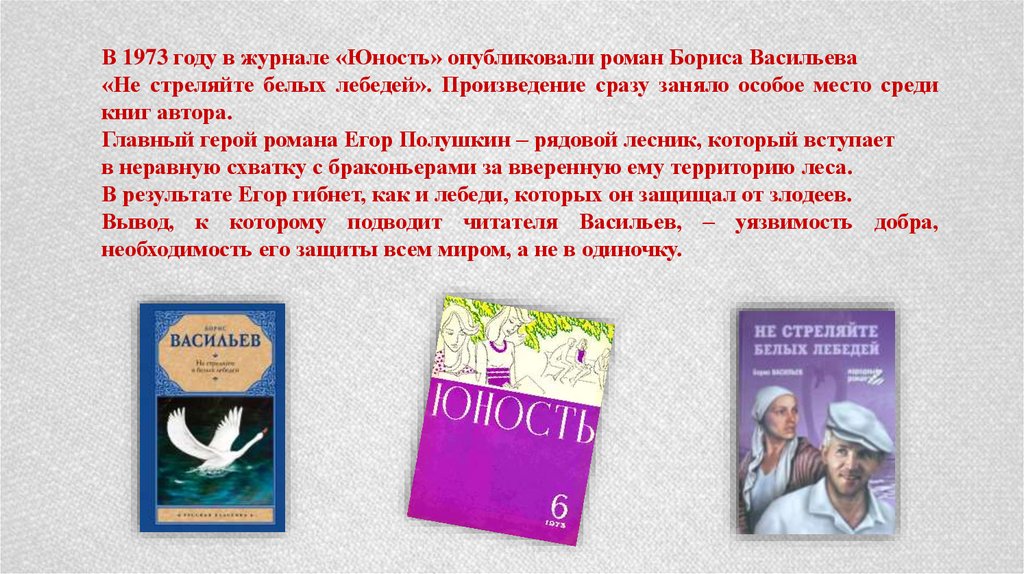 В 1973 году в журнале «Юность» опубликовали роман Бориса Васильева«Не стреляйте белых лебедей». Произведение сразу заняло особое место среди