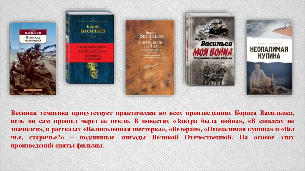 Военная тематика присутствует практически во всех произведениях Бориса Васильева,ведь он сам прошел через ее пекло. В повестях «Завтра была война», «В списках не