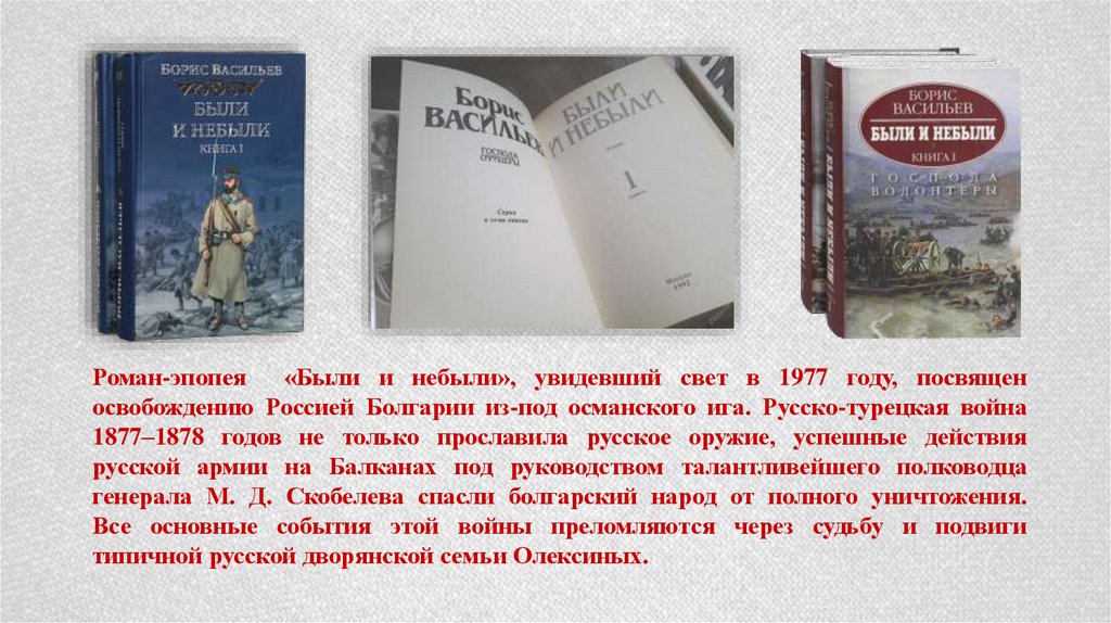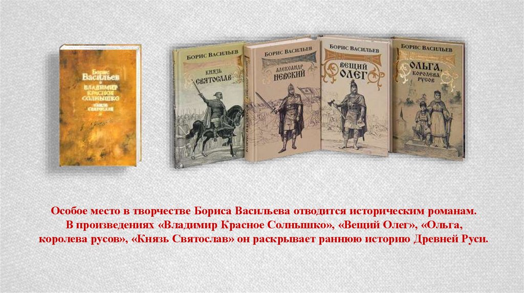 Особое место в творчестве Бориса Васильева отводится историческим романам.В произведениях «Владимир Красное Солнышко», «Вещий Олег», «Ольга,