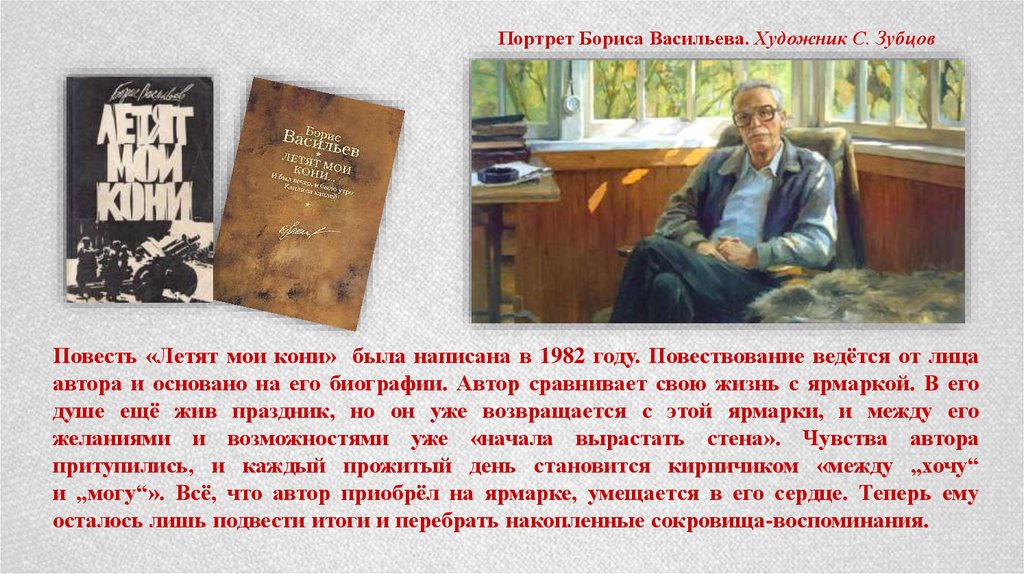 Портрет Бориса Васильева. Художник С. ЗубцовПовесть «Летят мои кони» была написана в 1982 году. Повествование ведётся от лица