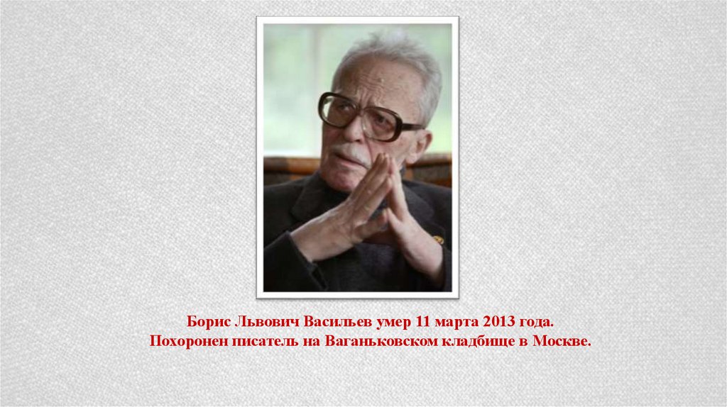 Борис Львович Васильев умер 11 марта 2013 года.Похоронен писатель на Ваганьковском кладбище в Москве.